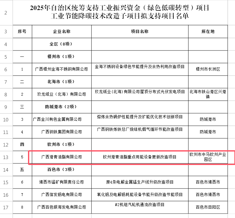 为进一步强化政策资金的支持和引导效能,促进企业向高端化、智能化、绿色化方向发展,港青油脂积极申报自治区工业振兴(绿色低碳转型)专项资金项目,并于日前顺利通过拟支持项目名单公示期。